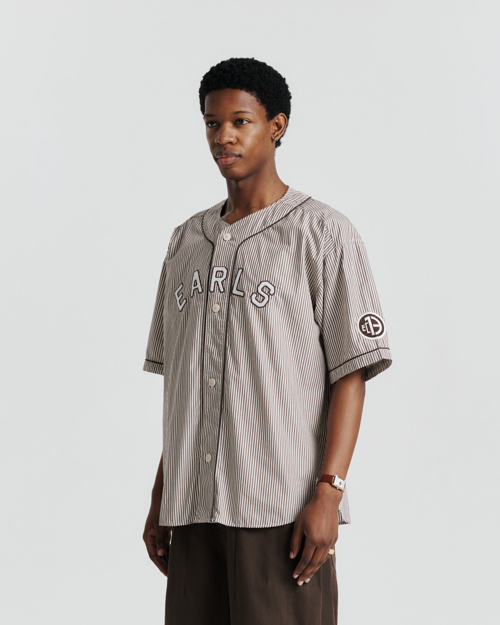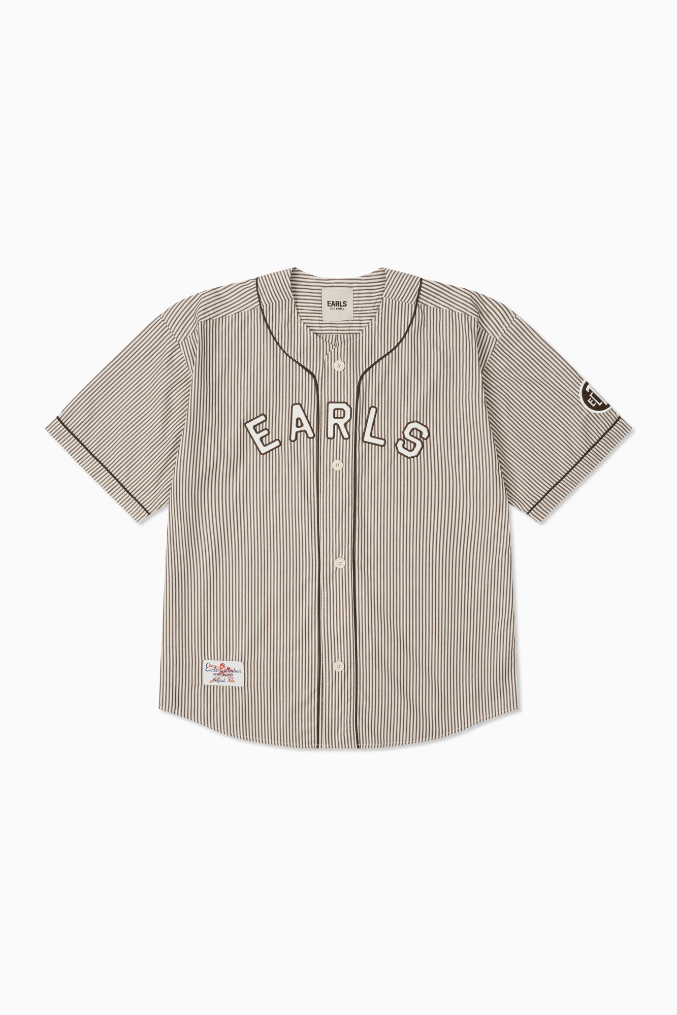 The Baseman Shirt reimagines a sporting classic through a refined lens. Crafted from 100% cotton using superfine compact yarn, it delivers a crisp yet lightweight handfeel that elevates everyday wear. A bold felt 'EARLS' applique spans the chest, contrasted with piping along the sleeves and placket for a sharp, athletic finish. The design is completed with the Earls Sportswear woven label, placed just above the hem for a subtle signature detail.