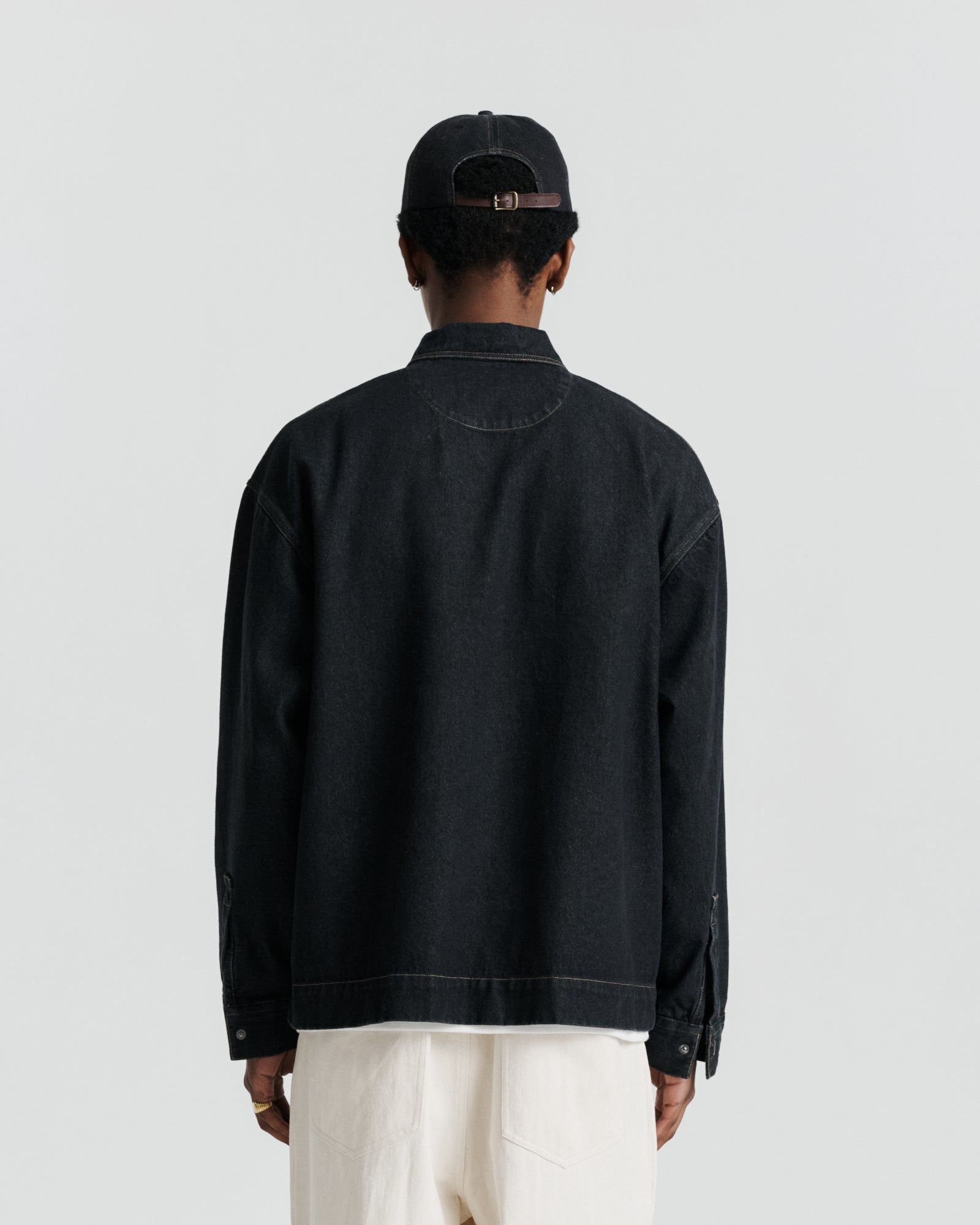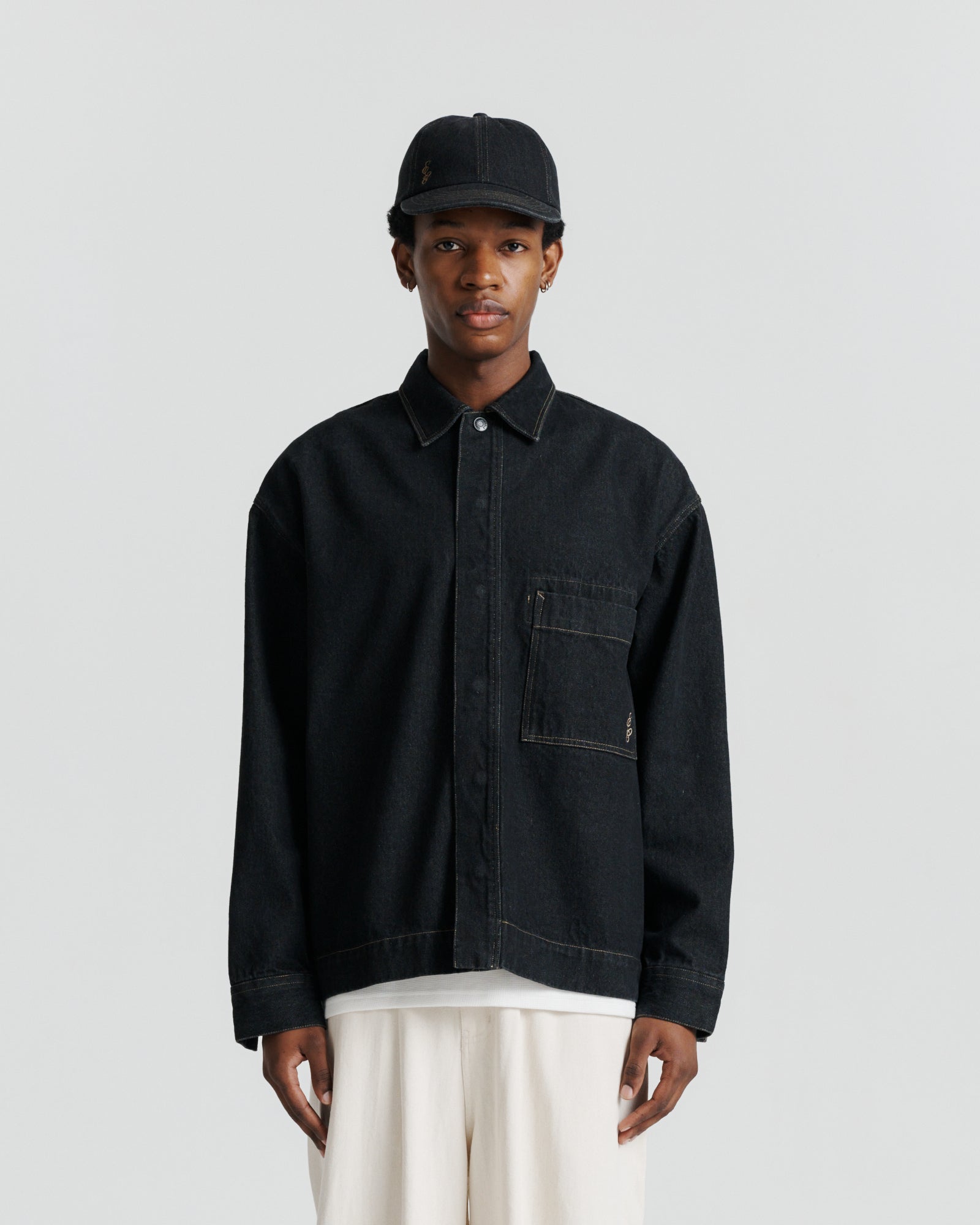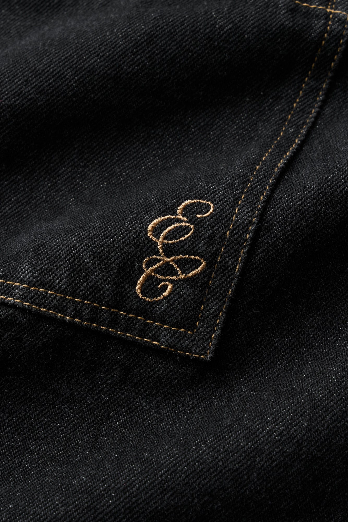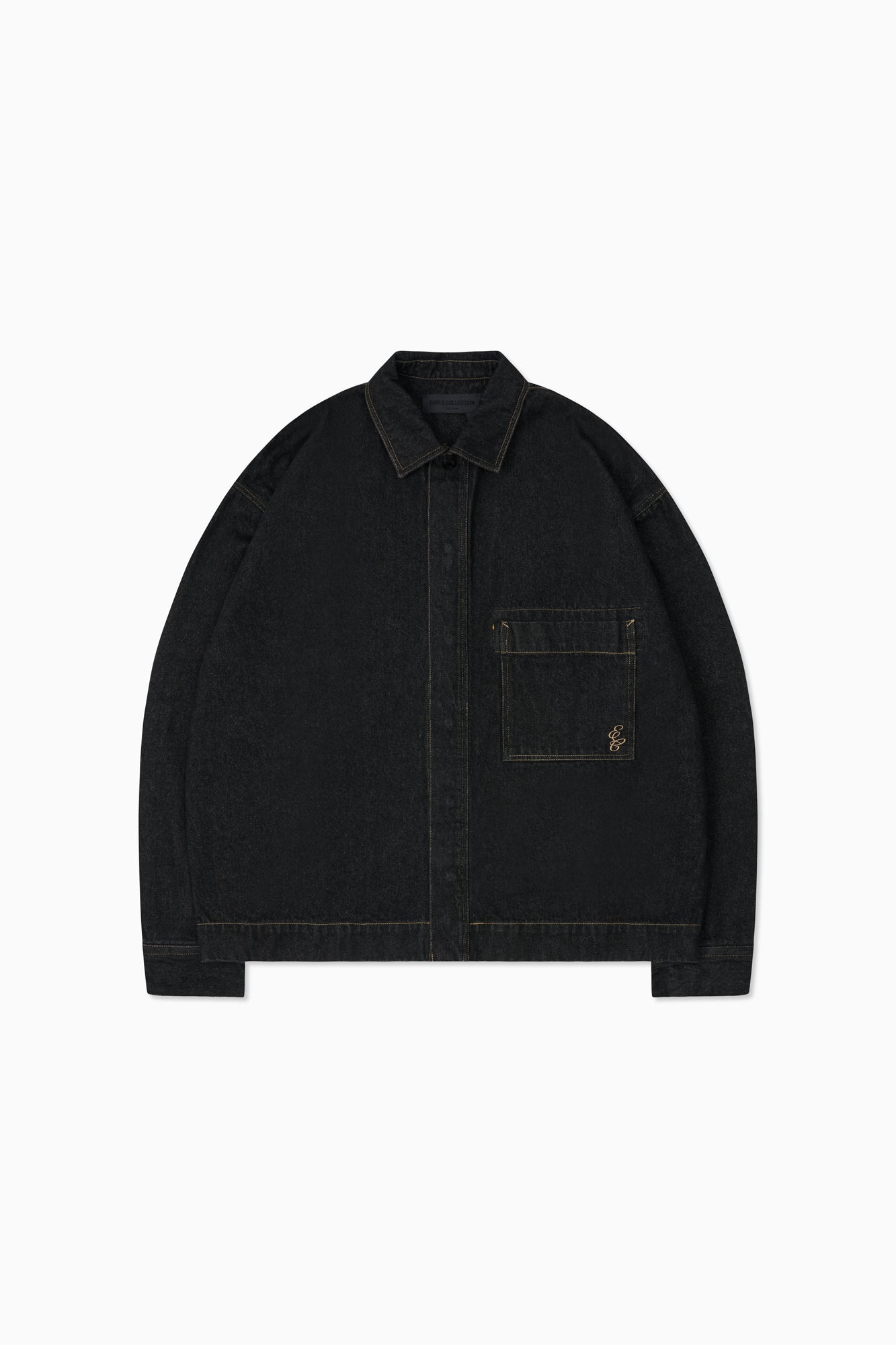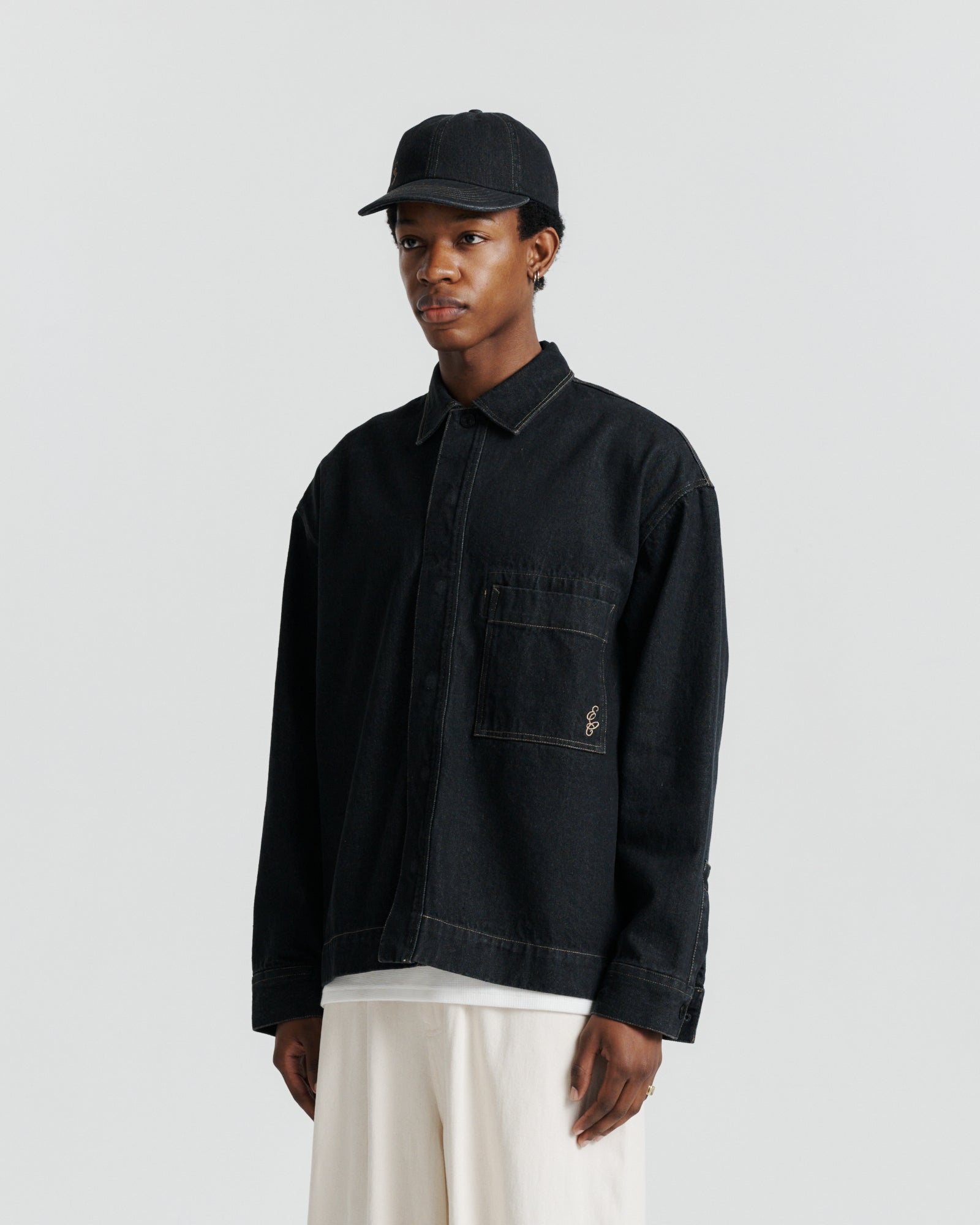 The Button Denim Shirt is a heavyweight overshirt that blends utilitarian design with refined detailing. Crafted from robust denim, it features concealed button closures for a clean, minimal front, accented by contrast stitching throughout. A subtle 'EC' embroidery on the chest pocket adds a signature touch. With its structured fit and durable construction, this piece is designed to be worn layered or on its own, offering year-round versatility.
