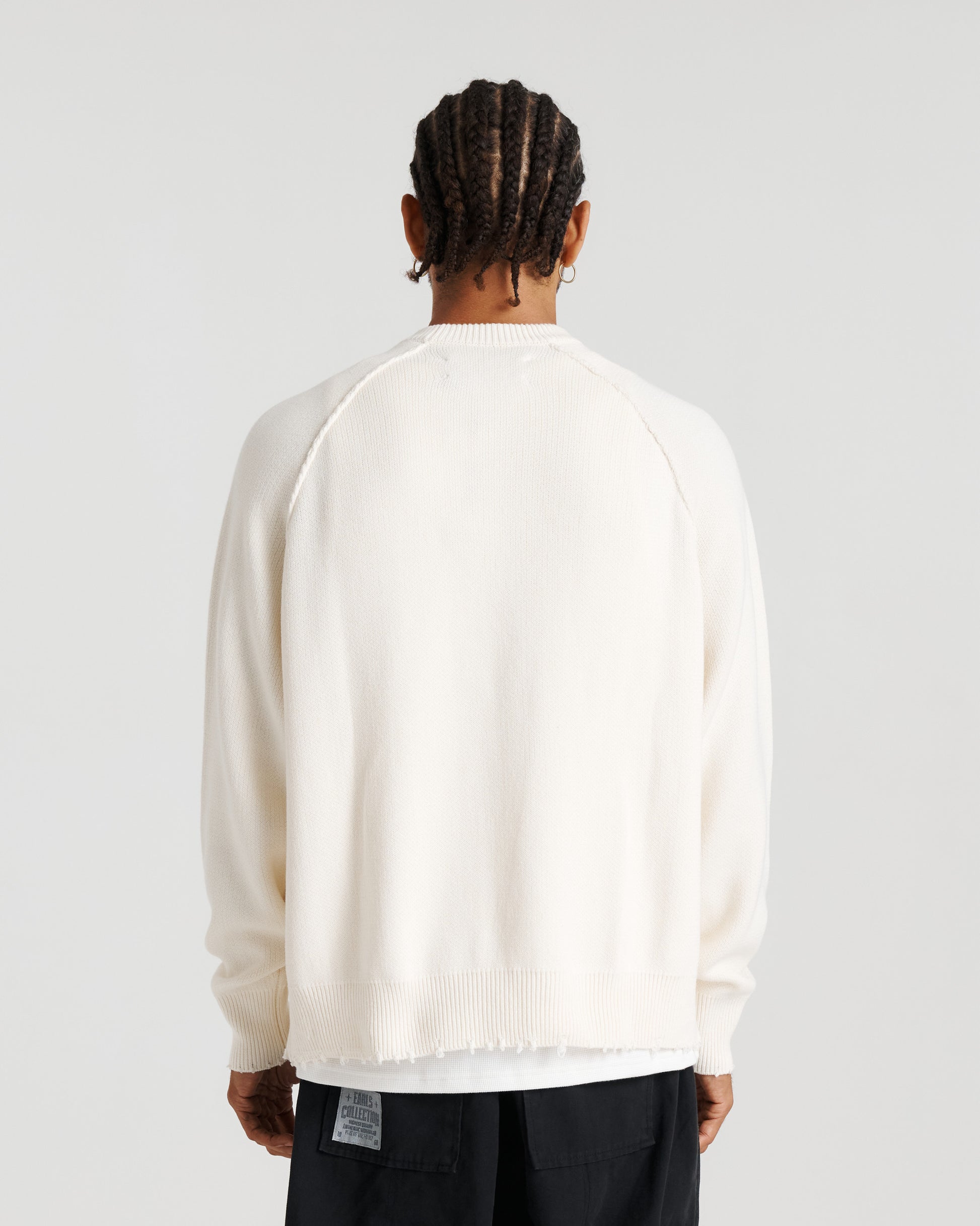 Blending refined construction with a rugged finish, the Distressed Hem Knit Crew is crafted from 100% cotton yarn in a fully fashioned knit. Raglan sleeves offer a relaxed silhouette, while raw-edge distressing at the hem and cuffs adds a lived-in feel. A premium embroidered detail at the centre-front chest rounds out the piece with a subtle point of elevation.