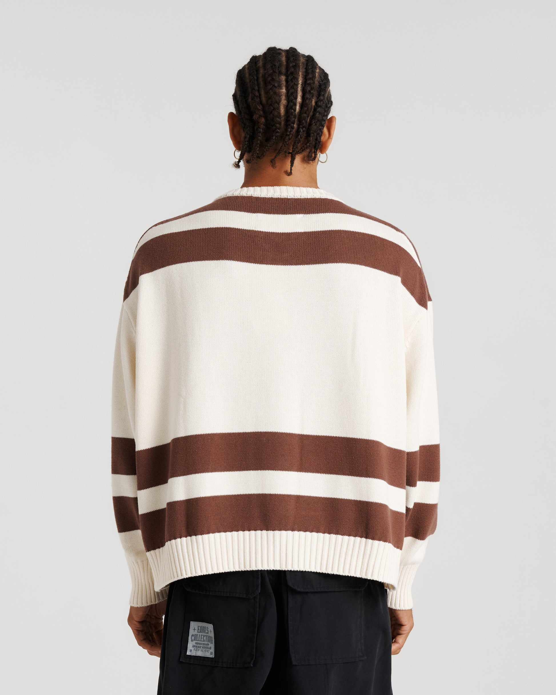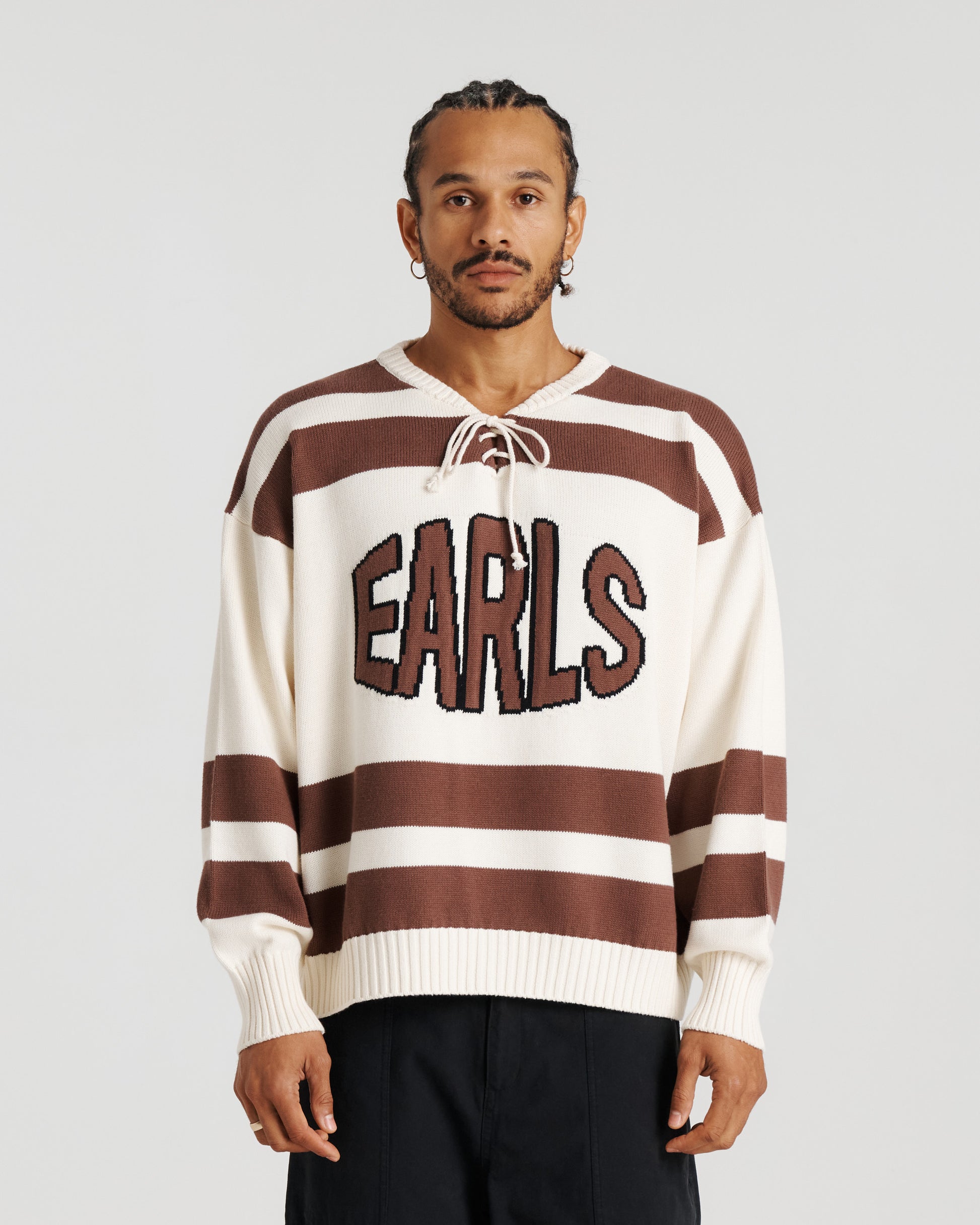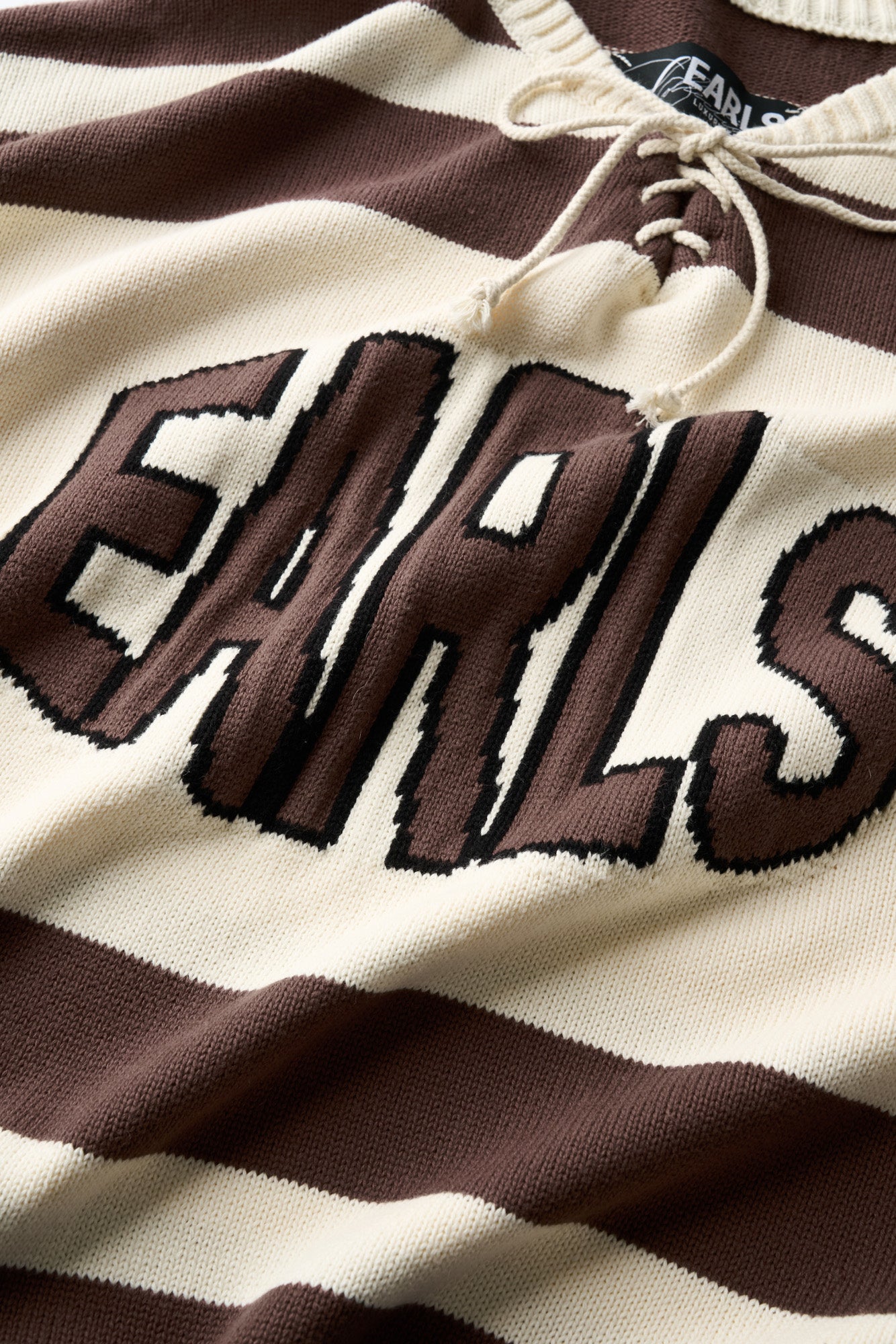 Inspired by classic on-ice uniforms, the Hockey Knit is a heavyweight sweater reimagined through a vintage lens. Featuring bold horizontal striping and lace-up detailing at the neck, it nods to traditional hockey jerseys while maintaining a refined, wearable edge. Cut with a boxy, oversized fit, it balances sport and style in equal measure.
