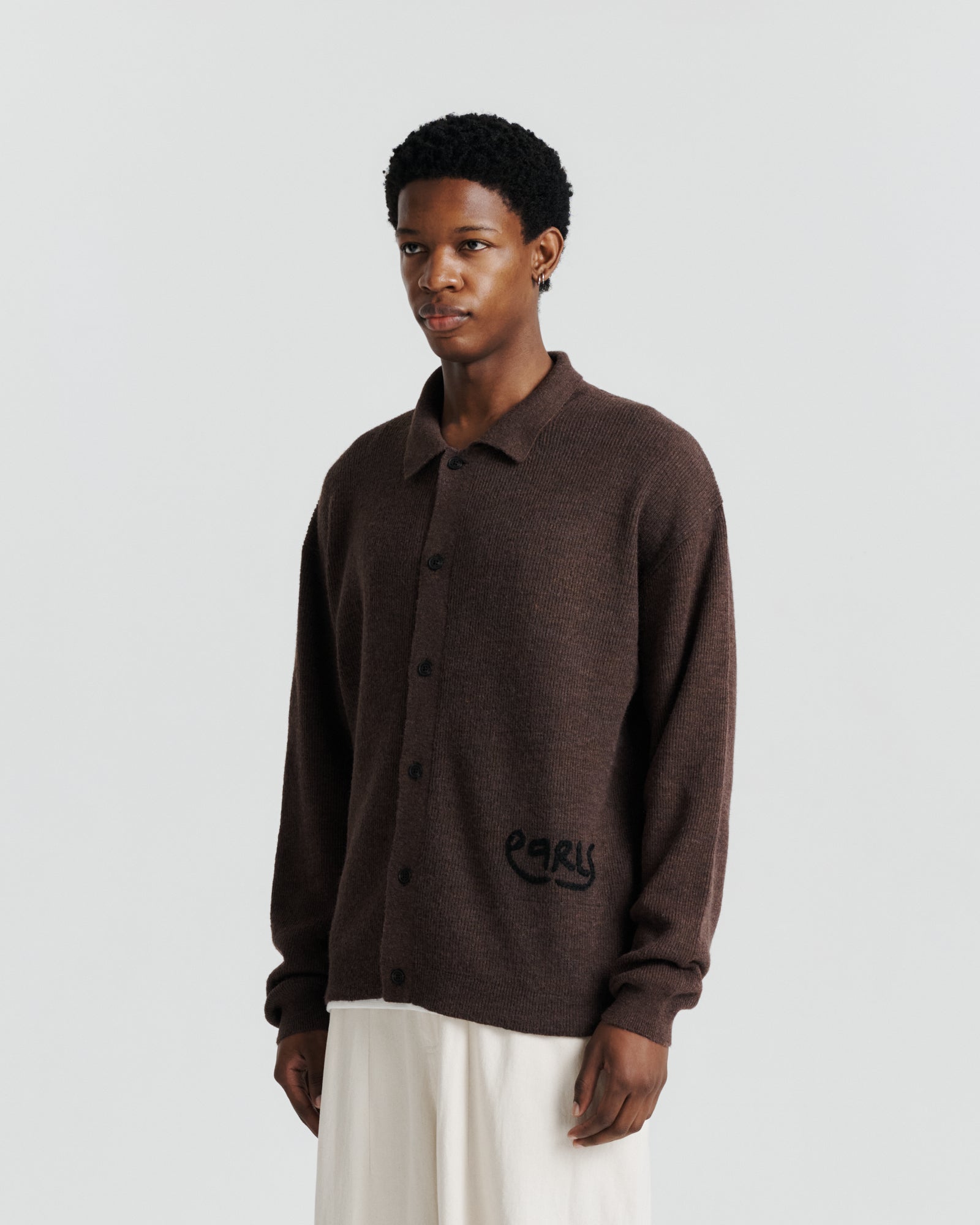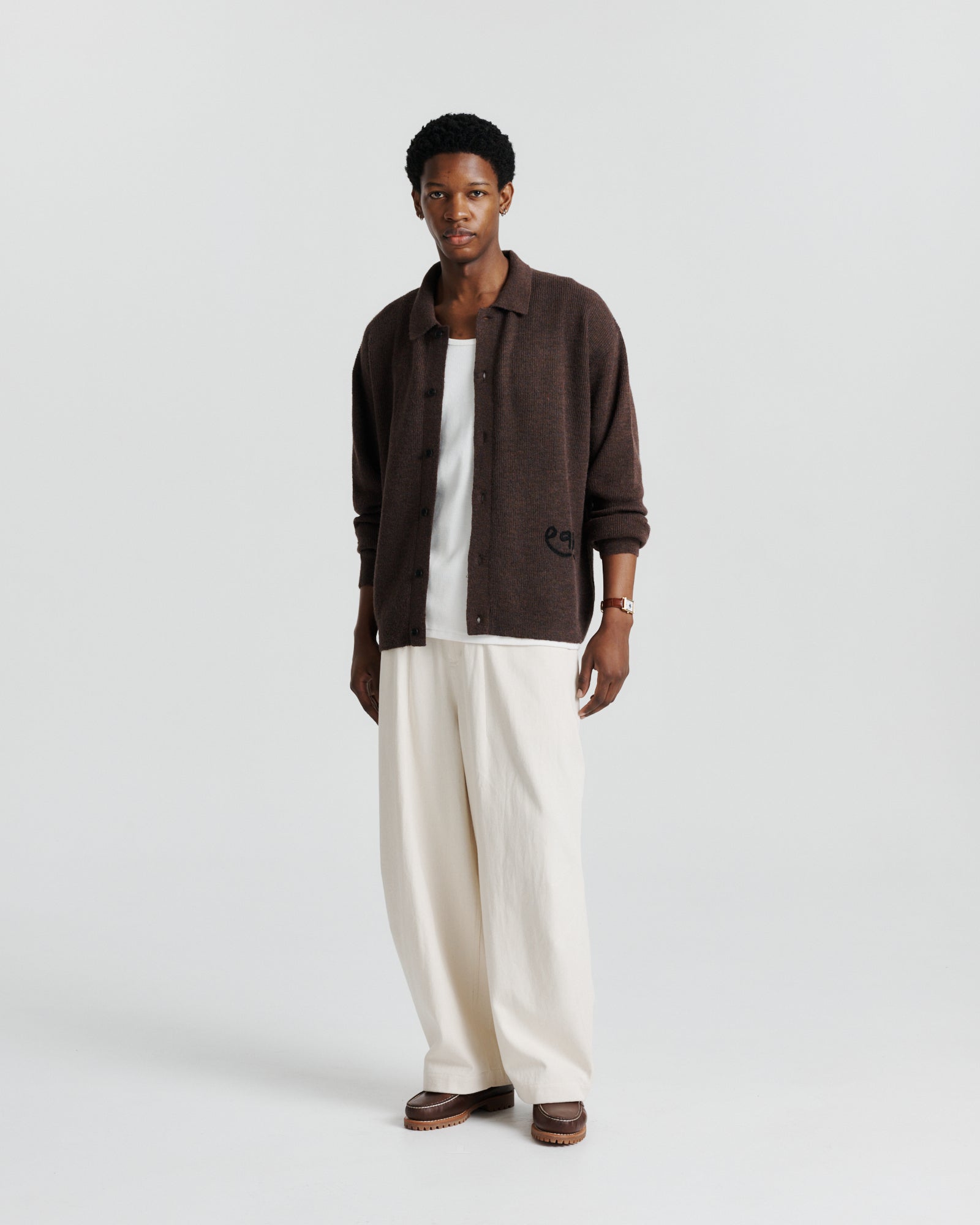 The Knit Shirt Cardigan elevates traditional knitwear through a refined silhouette and textural depth. This true knit button-up shirt features a superfine cableknit pattern and is cut for a relaxed yet polished fit. Finished with hand-stitched embroidery at the hem, it combines softness and structure with a considered blend of yarns.