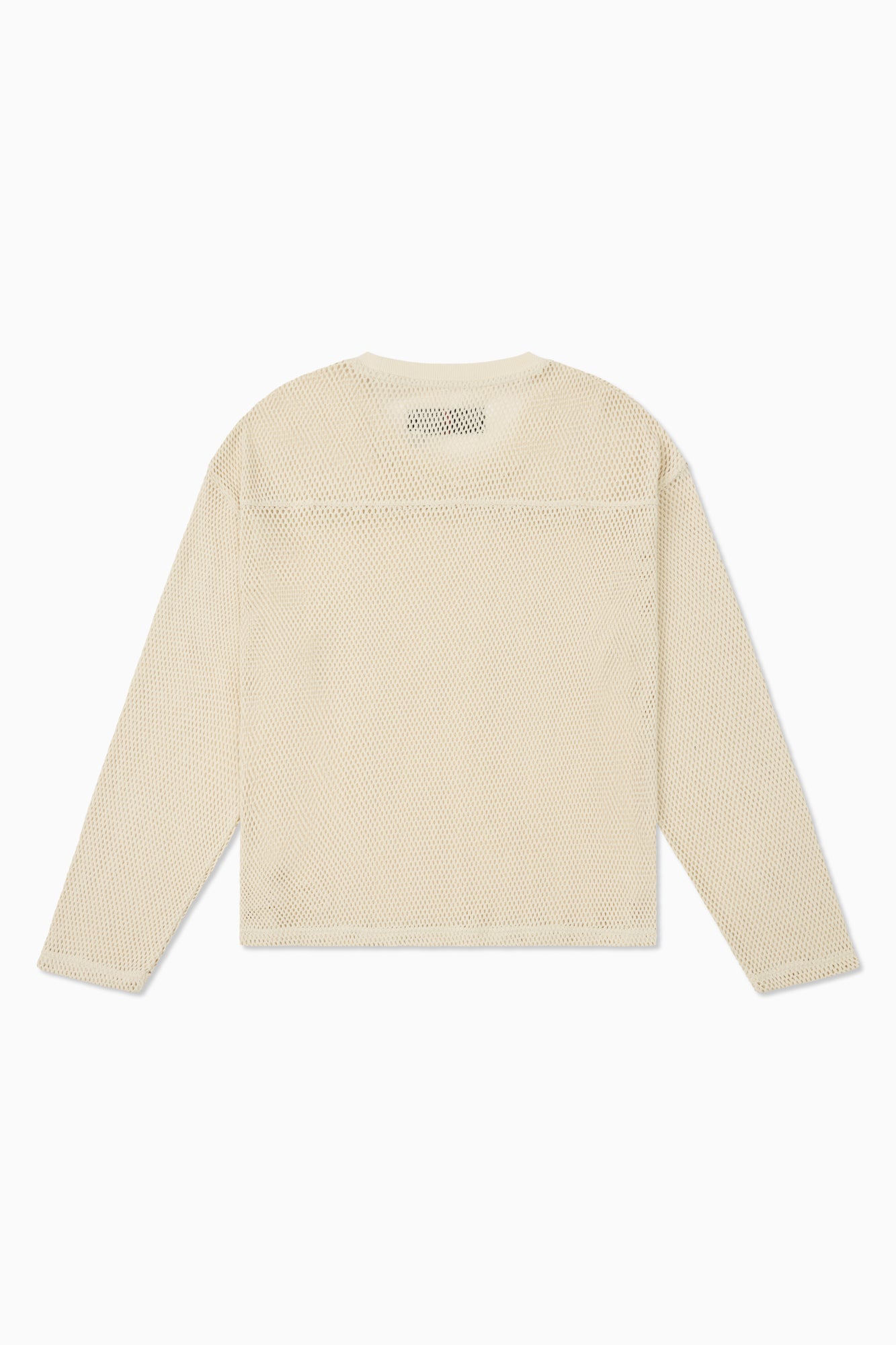 The Practice Crew is an airy, heavyweight long sleeve crewneck constructed from 100% cotton crochet mesh. The crew has a boxy, oversized and slightly cropped fit, features a sports-inspired seam detail at the front chest and is finished with hand-stitched embroidery at the hem.