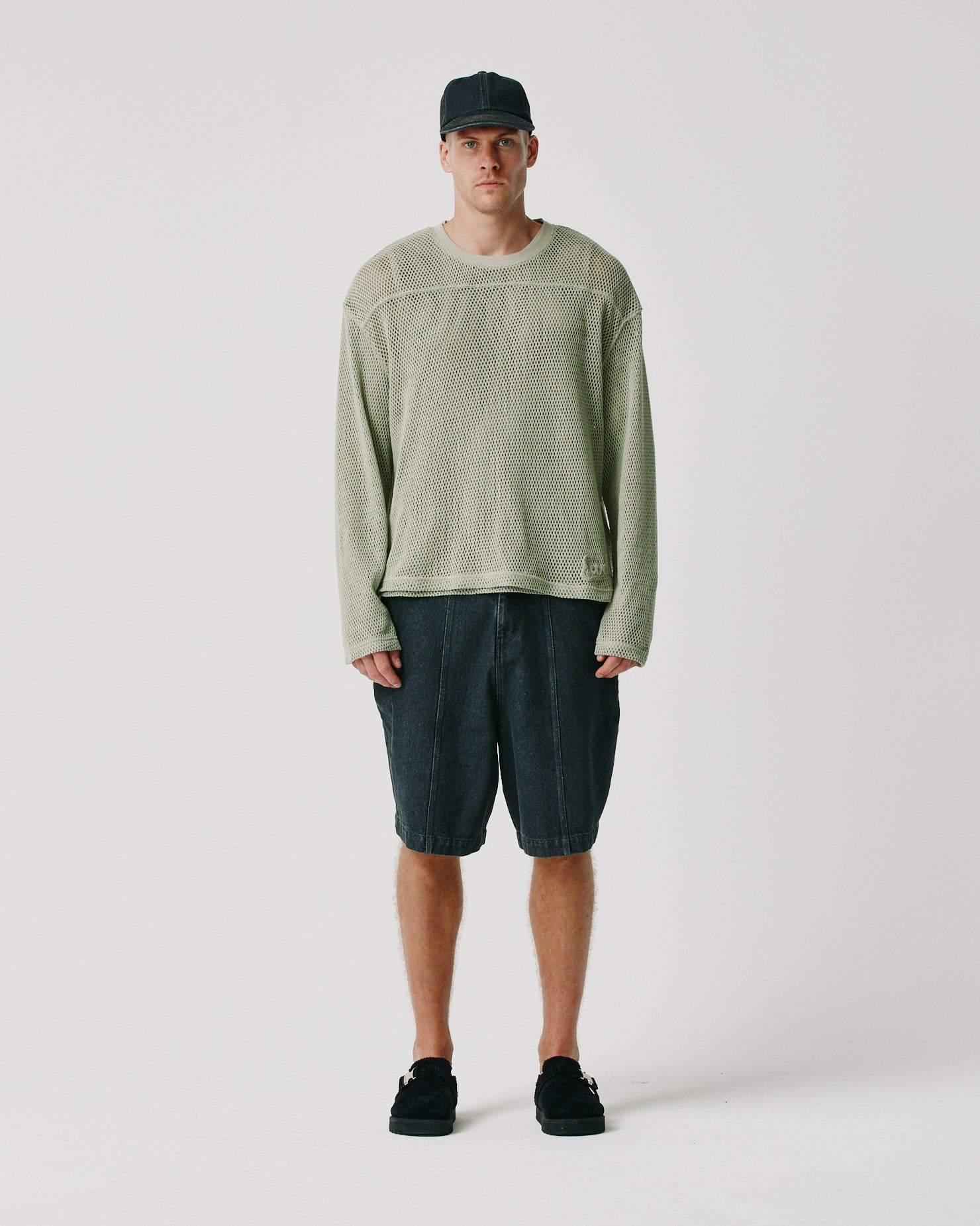 The Practice Crew is an airy, heavyweight long sleeve crewneck constructed from 100% cotton crochet mesh. The crew has a boxy, oversized and slightly cropped fit, features a sports-inspired seam detail at the front chest and is finished with hand-stitched embroidery at the hem.