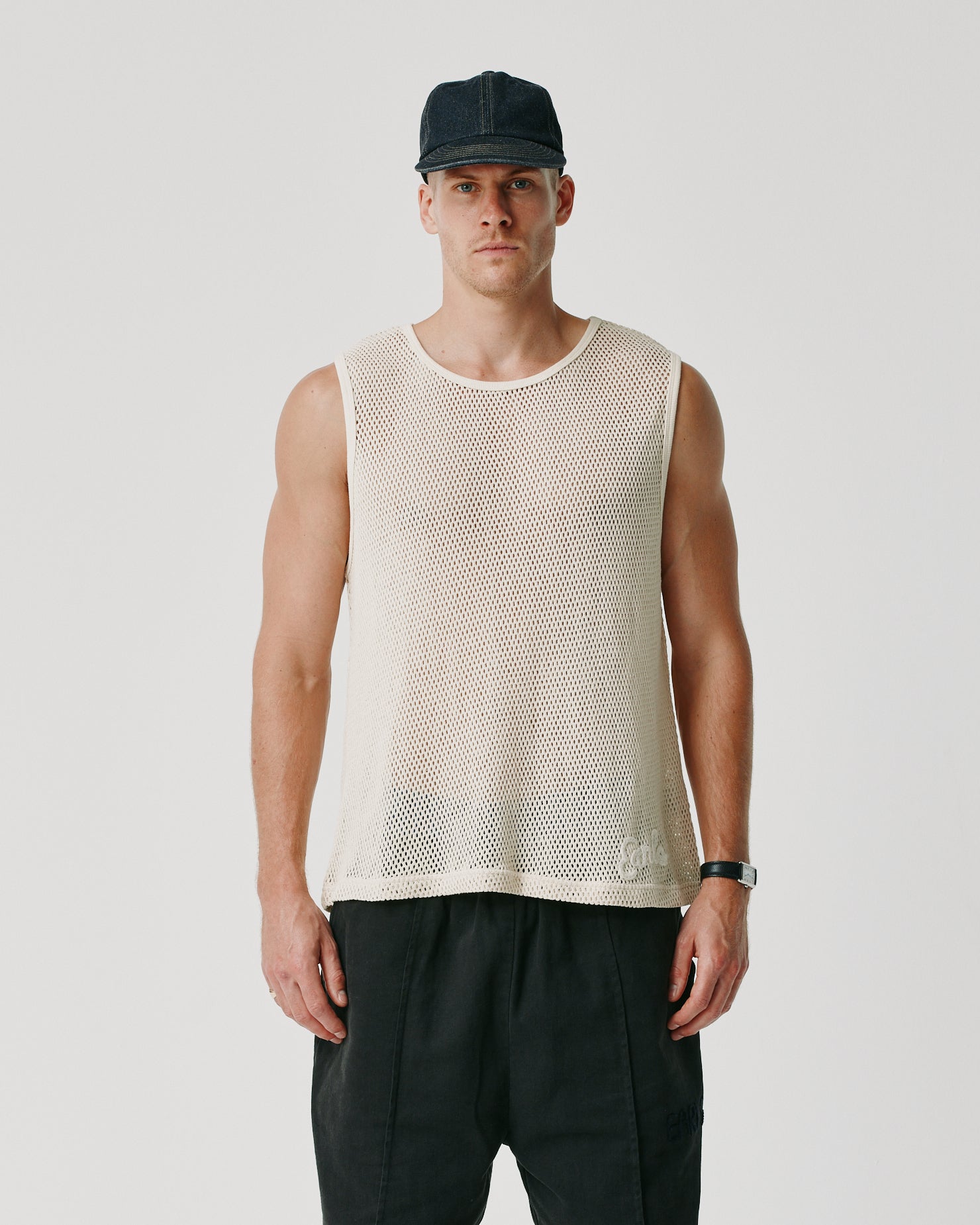 The Practice Tank is an airy, heavyweight singlet constructed from 100% cotton crochet mesh. The tank has a boxy, oversized and slightly cropped fit and is finished with hand-stitched embroidery at the hem.