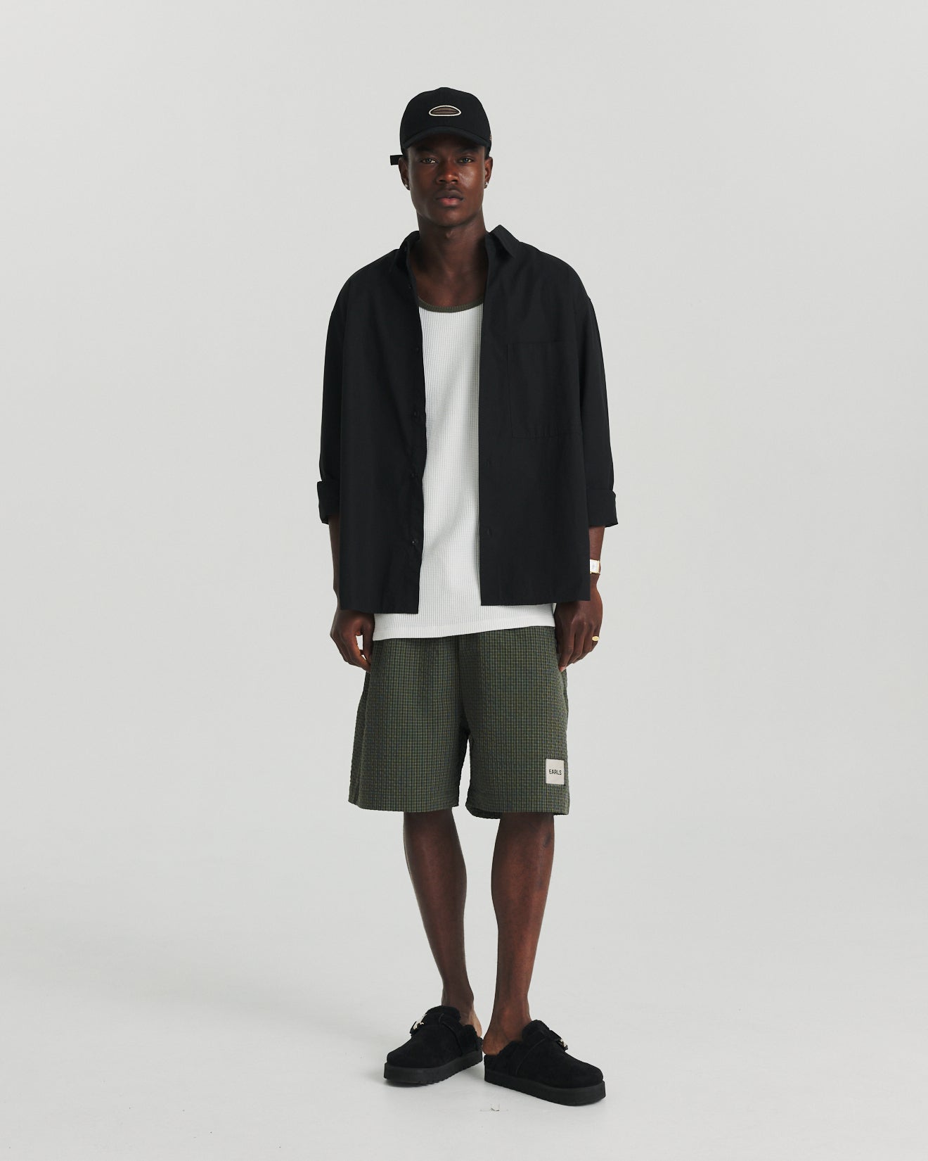 The Seersucker Swim Short is a lightweight, slightly above-the-knee style built for warm-weather wear. Constructed from a textured 98% polyester, 11% rayon seersucker fabric, it offers quick-drying performance with subtle structure and comfort. The short features polyester mesh pocket lining for drainage, a natural twisted cotton drawcord at the waist, and is finished with an ‘Earls’ woven label for a refined touch.