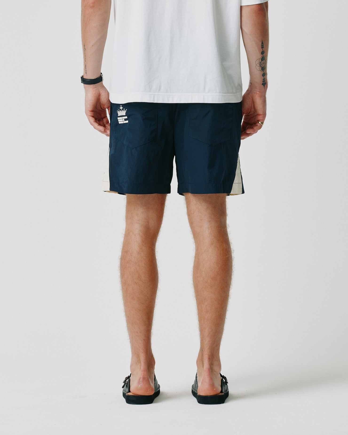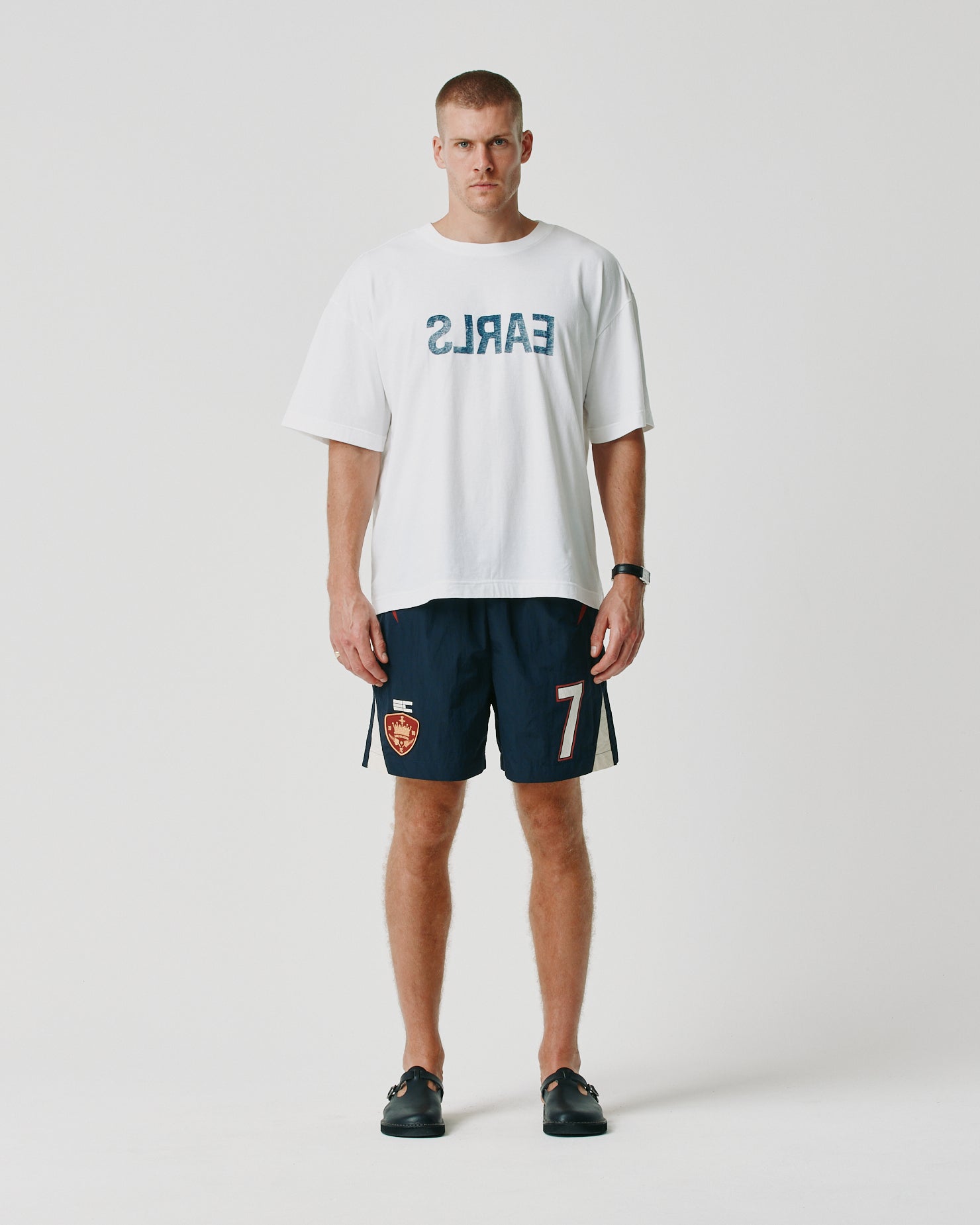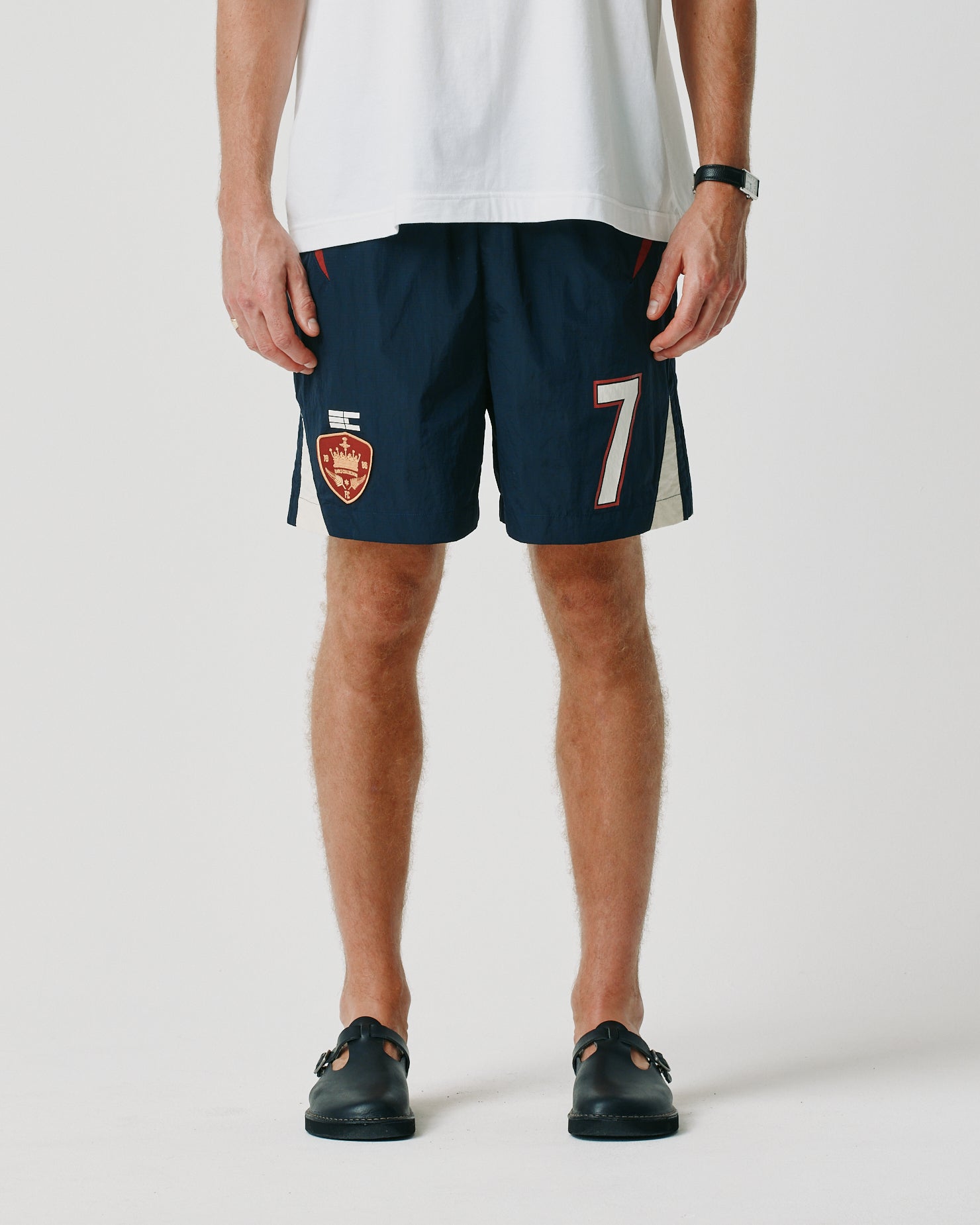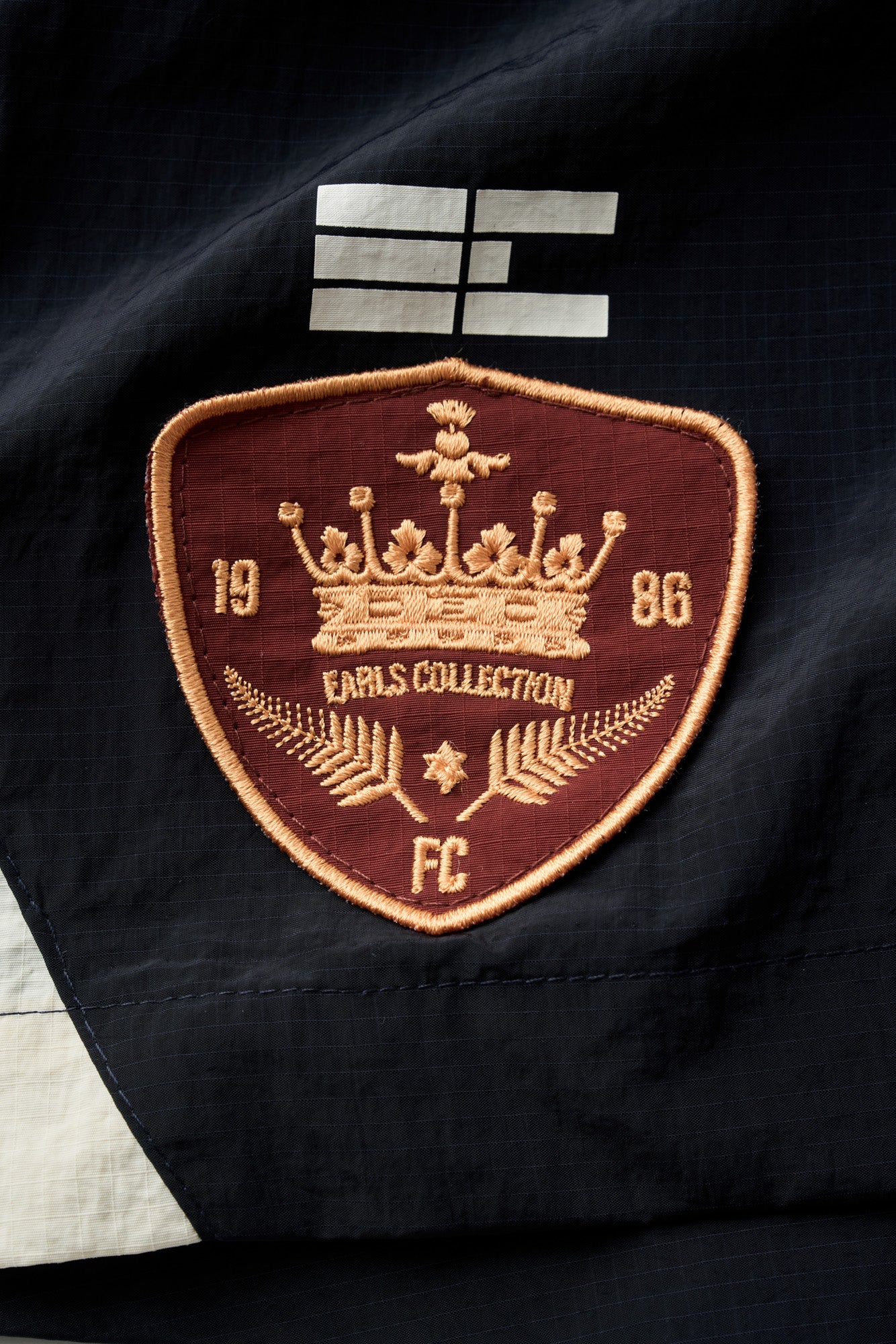 The Striker Short celebrates the excitement of early 2000's football. The shorts have an above-the-knee fit and feature a range of branded appliques including an embroidered patch of the Earls FC crest, a large number 7 screen print honoring some of the world's most exciting attacking players and additional EC sportswear branding. The shorts are constructed from 100% ripstop nylon and are constructed with contrasting panels throughout.